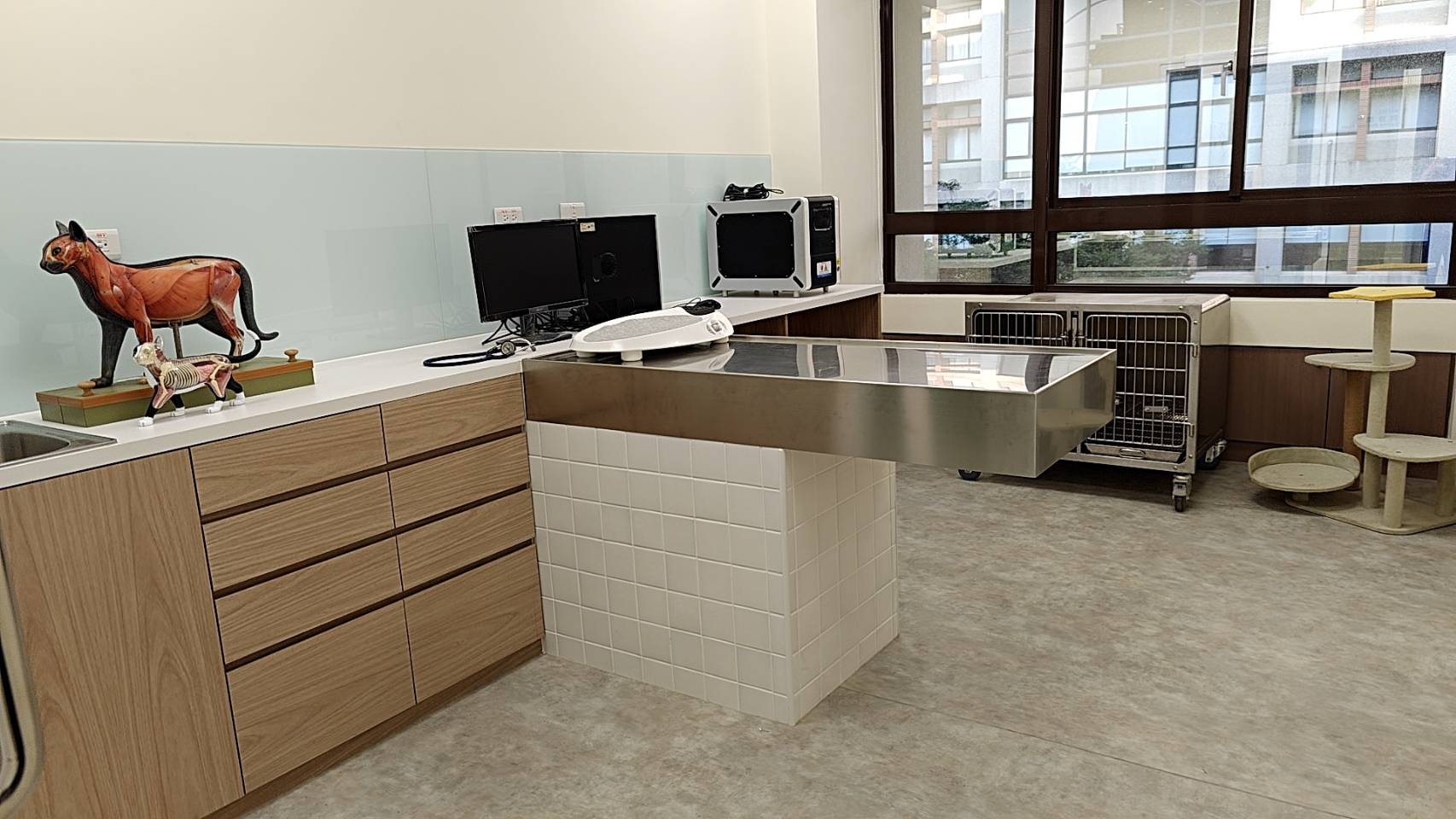 因應動物保健人才需求的增加,學校對動保系軟硬體設備大力投入。動物保健多功能專業教室去年修建完成,光線明亮、色彩溫和,可以提升學生專注力及寵物情緒穩定。因此,我們將部分動物照護課程在此場域授課。